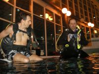 POBORSKÝ JDE POD VODU. Skokanský bazén na českobudějovickém plaveckém stadiónu je přes zimu využíván sportovními potápěči k výcviku nových adeptů tohoto atraktivního sportu. Do základního kurzu potápění dle mezinárodně platných směrnic školy SSI se tento týden zapojil i bývalý fotbalový reprezentant Karel Poborský (vlevo). První cestu pod vodu absolvoval s instruktorem Karlem Exlem z Octopus clubu České Budějovice. (pok)
